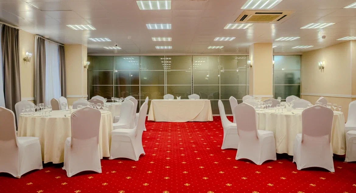 Светлые и просторные банкетные залы, разнообразное меню, уютные номера для гостей.